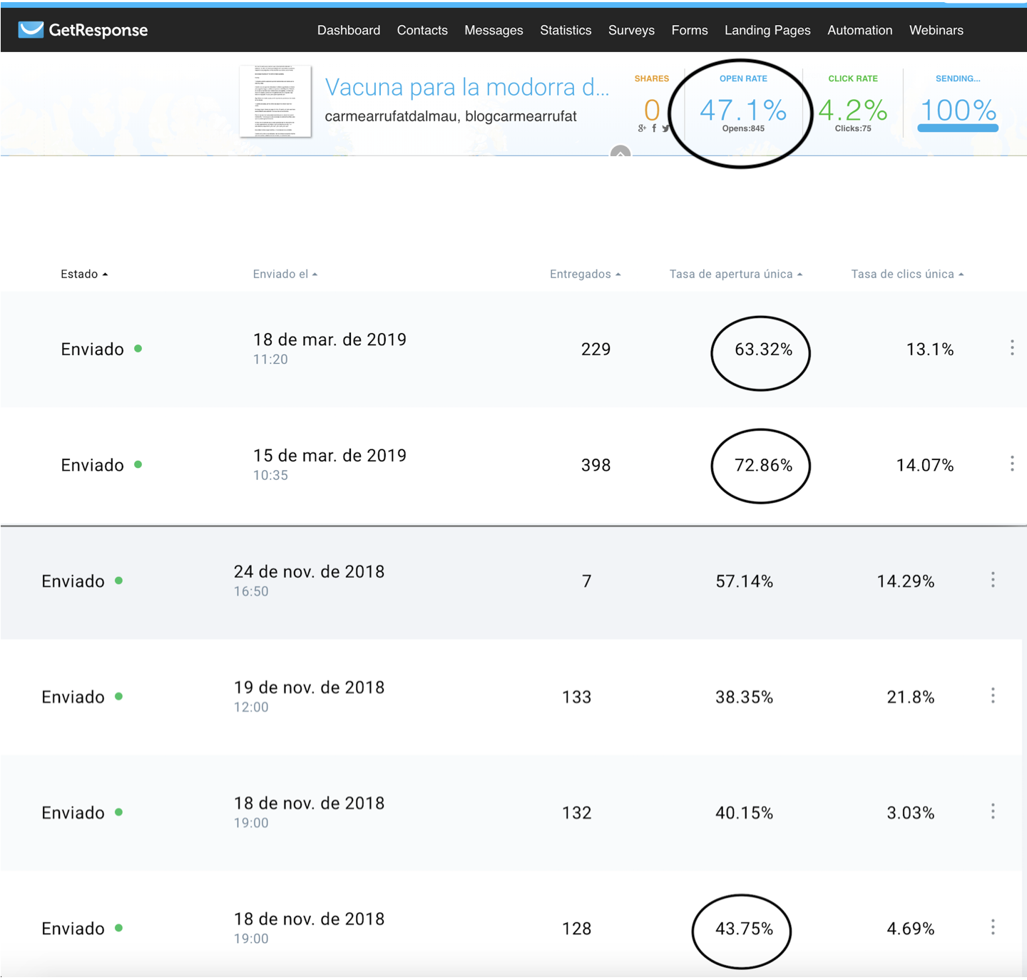 Pues te estoy mostrando uno de los últimos emails que mandé y que tuvo una tasa de apertura muy alta.