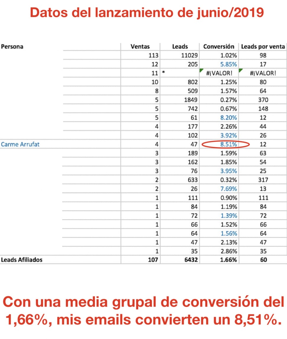 «Lo que nos resulto muy llamativo a la comunidad de afiliados fueron los maravillosos emails de Carme, que los estábamos esperando con deleite; eran preciosos, muy interesantes y apetecía leerlos. Nos llamaron mucho la atención sus tasas de apertura, del 70%. Y, todos, como locos, quisimos aprender cómo lo hacía. Y nos pusimos a aprender con ella. Tanto Carme como su hermana fueron las dos afiliadas que tuvieron la tasa de conversión más grande de todo el lanzamiento.«